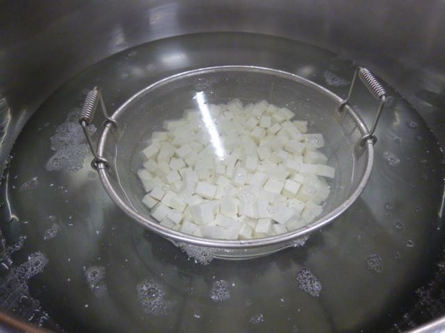 崩れにくいように、豆腐は湯通しをしてから入れます。