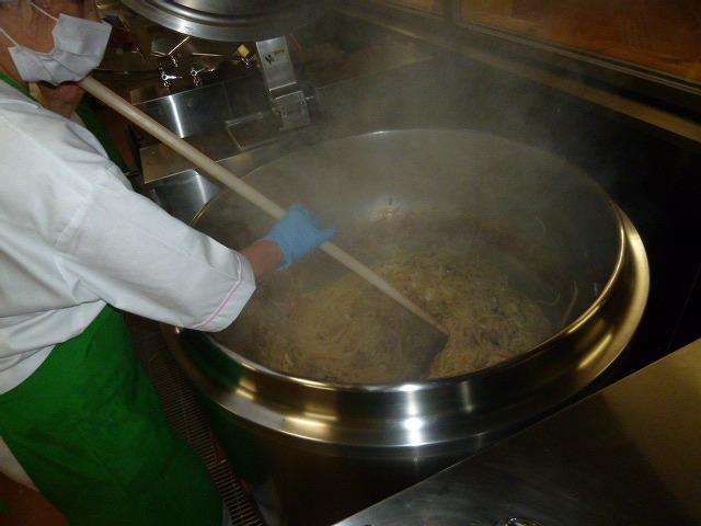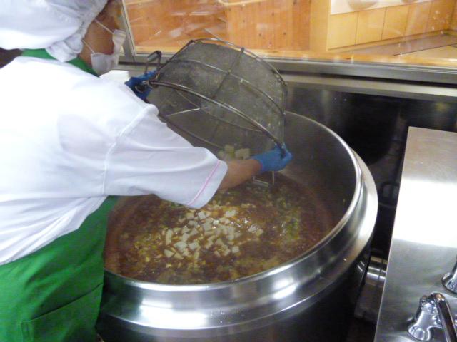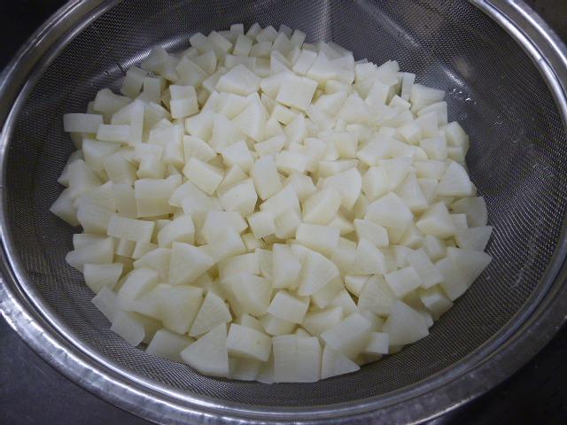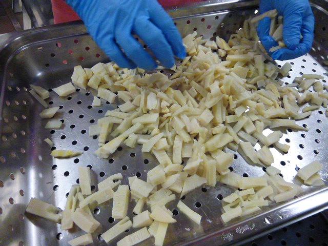 給食で大根の煮物をつくるときは、味が染み込みやすいように、下茹でしています。