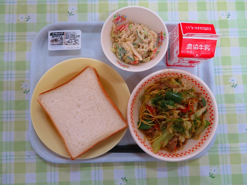 今日は久しぶりの焼きそばです。給食の焼きそばの麺は細めの乾麺を