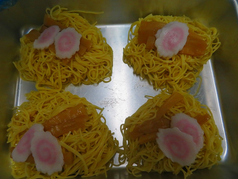 配りやすいように、平等に行きわたるように麺にメンマ、なるとを