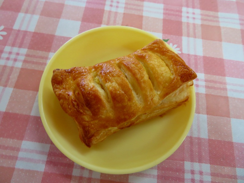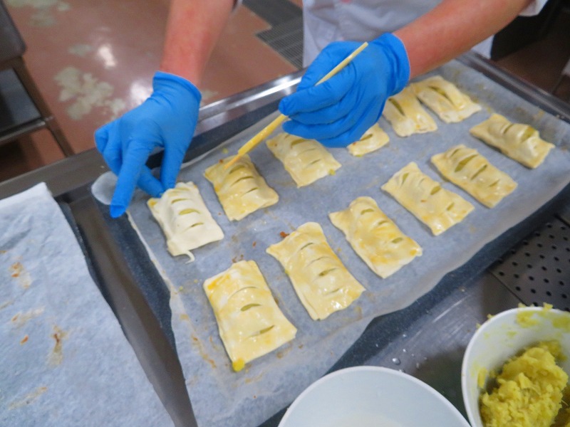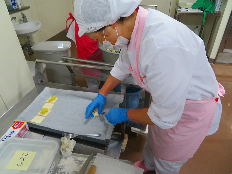 おさつパイ」を作りました。蒸してつぶしたさつまいもを切り分けた