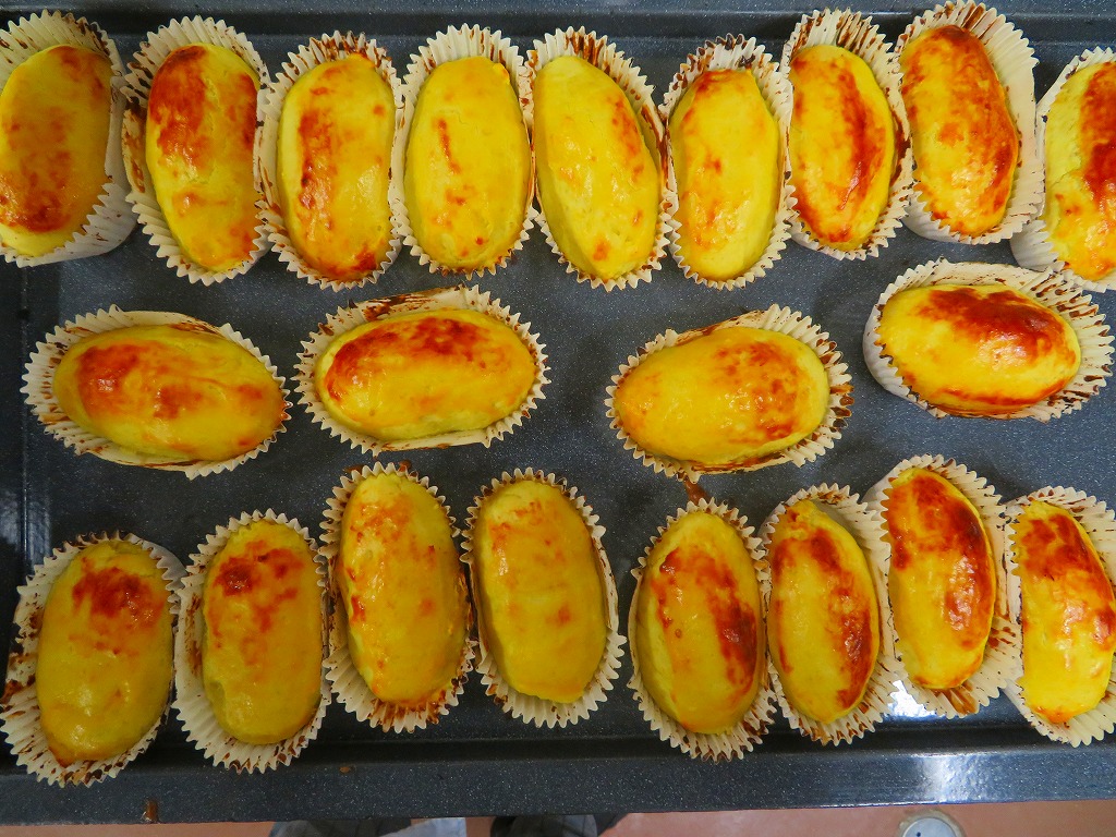 にたまごを塗ってオーブンで焼きます。甘くておいしいデザートで、生徒