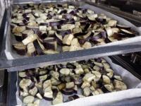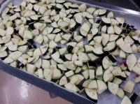 なすは色止めのために、スチームコンベクションで加熱処理をしてから鍋に加えています。