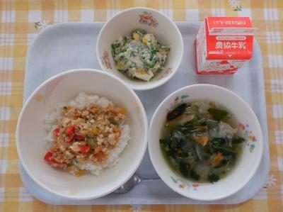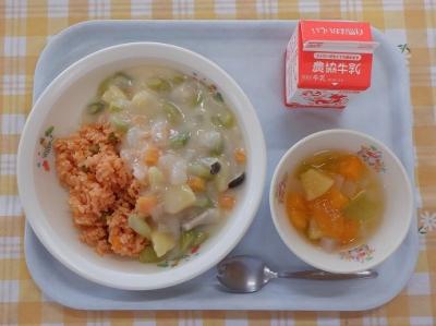 2023年7月12日 18時45分今日は、チキンライスと町野産のアスパラガスをたっぷり使用したシチューの組み合わせでした。
