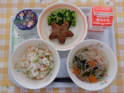 給食でも「七夕」を楽しめるように、今日の献立には、そうめんを入れたすまし汁、星の形をしたハンバーグ、