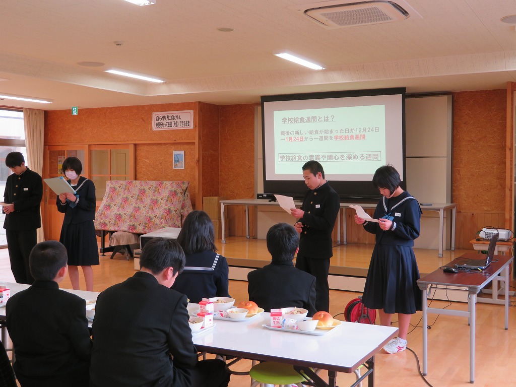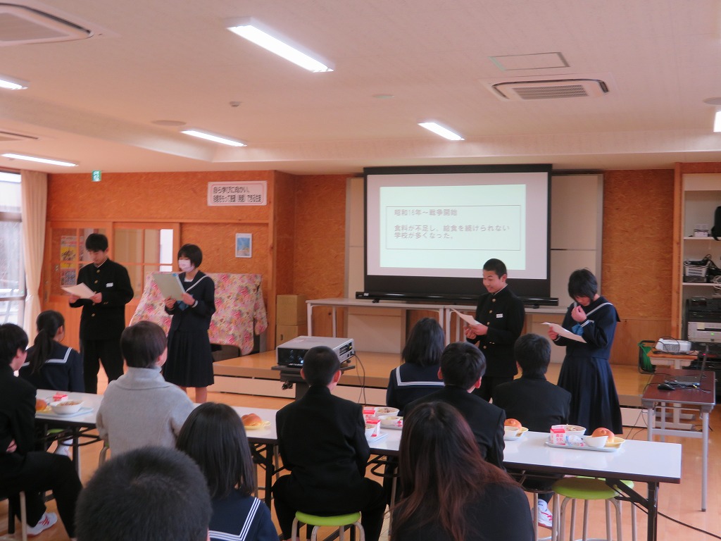 給食・情報委員会の生徒が学校給食の歴史について紹介しました。