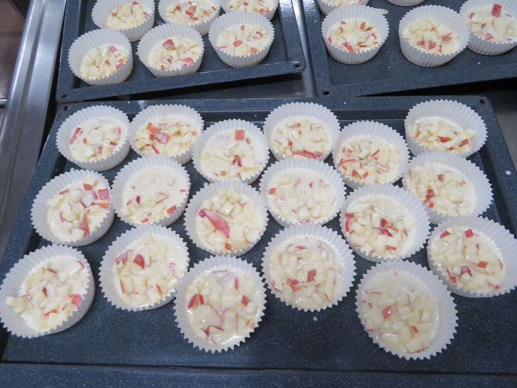 ホットケーキミックスにヨーグルトとりんごをたくさん加え、カップに