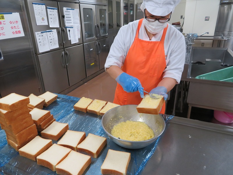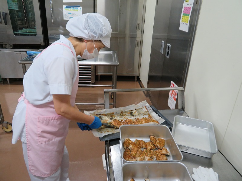 豚肉などは一度揚げてから作るのが一般的ですが、給食では、