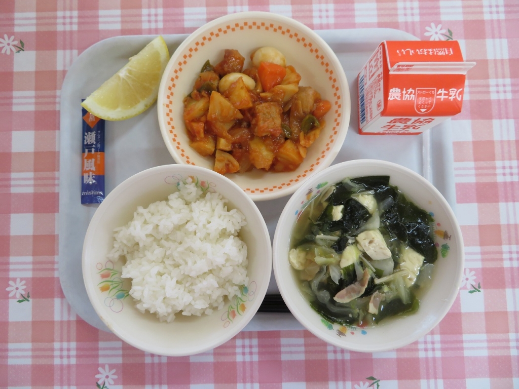 2018年9月26日 13時22分給食の酢豚は、豚肉・にんじん・じゃがいも・うずらたまご・