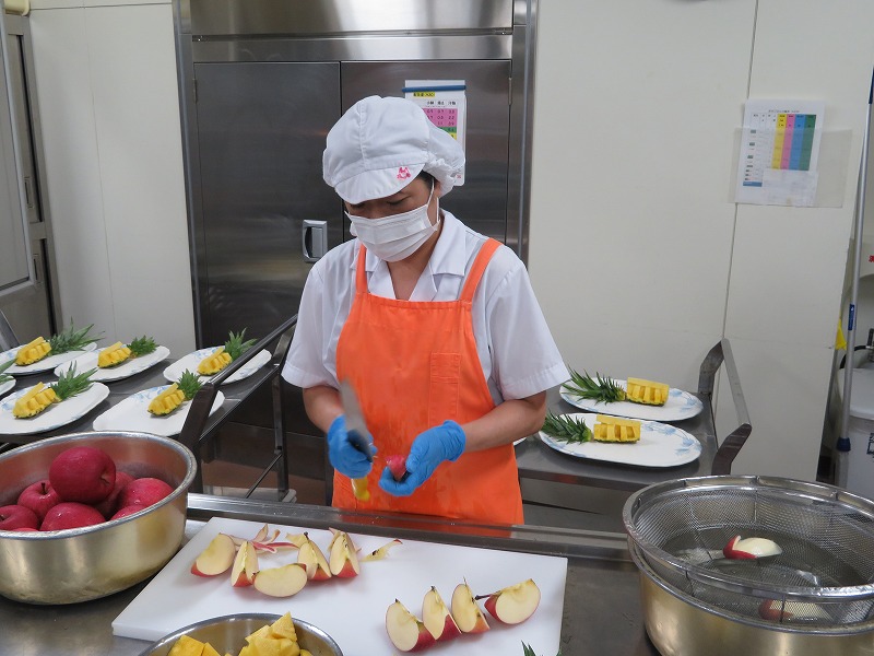 調理員さんがきれいに切り、並べてくれました。りんごもかわいいうさぎです!