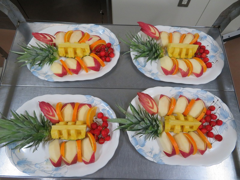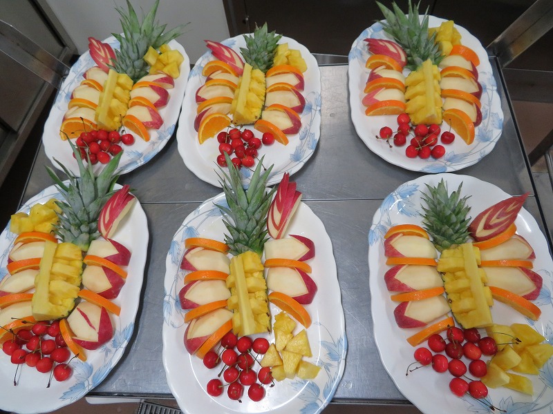 給食を食べました。また、各テーブルにフルーツの盛り合わせを