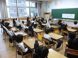 校長先生のお話の中で、「素敵な挨拶」について問いかける場面がありました。「相手の目をみてします」「自分から先にします」「相手の名前をよんでします」「おじぎもします」など、たくさんの意見が子供たちから出されました。よりよい挨拶をしようという意識の表れを感じました。