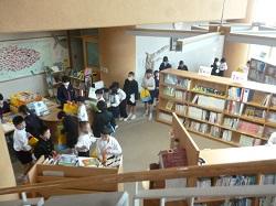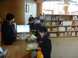 また、図書館ではたくさんの児童が列を作って本を借りています。