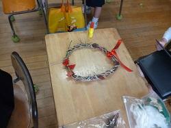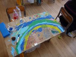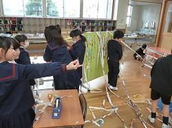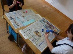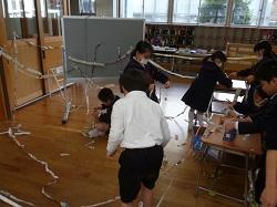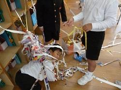 2年生が新聞紙や紙を細長く切ったものを、みんなでつないでつるすという学習をしてい
