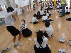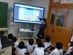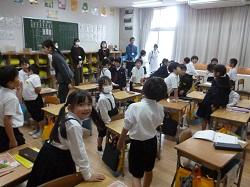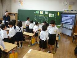 3年生は外国語の学習です。アンジェロ先生に対して、多くの児童が進んで自己紹介をしてい