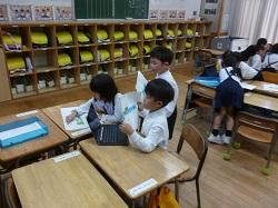 「上」という漢字の読み方を、教科書やタブレットを使って一生懸命調べる2年生。