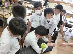 鉄の棒の温まり方をグループで力を合わせて調べる4年生。