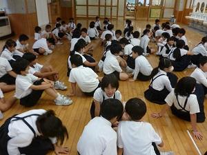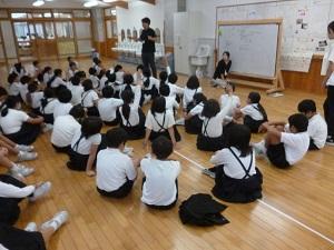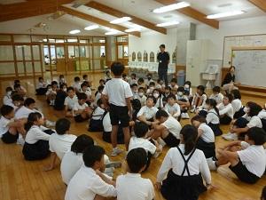 まずは先生と子どもたちで「ひと」と「やまびこ」になって練習。ひとの声が小さくなると