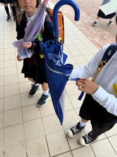 どの学年の児童も、傘について雨水を落として、傘をきれいにたたんで玄関に入ります。