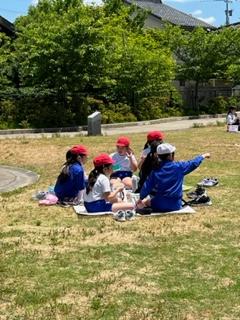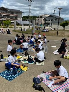 今日は、学年・学級で学校の周りでみんなで食べました。