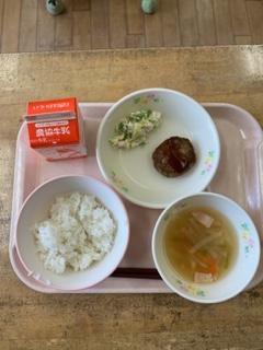 ハンバーグにサラダ、スープ、ごはん、牛乳でした。