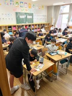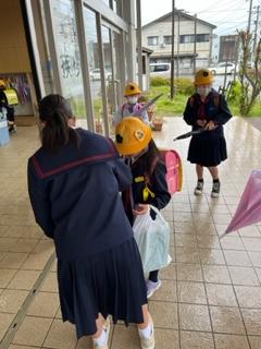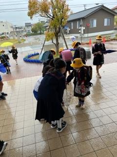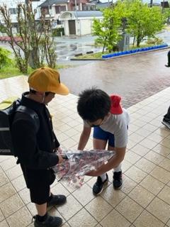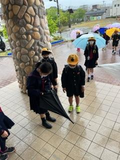 加えて、高学年児童がやさしく傘のしまい方を低学年児童に教えてくれていました。