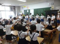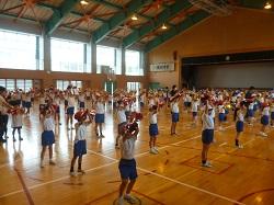 今日の朝時間に、1・2年生は6年生から運動会応援合戦の流を教わりました。