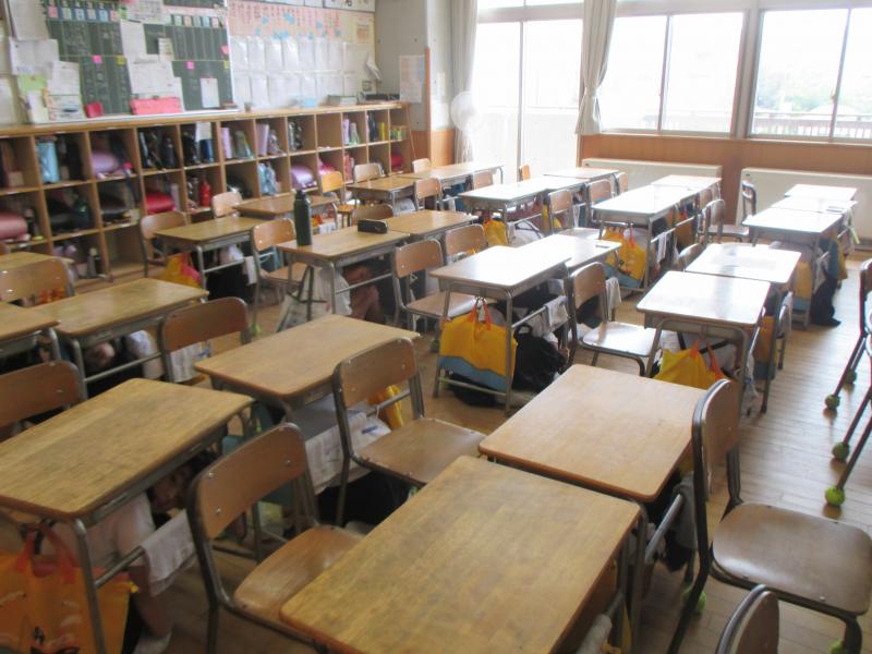 子供たちは、地震を想定した身の安全を守る「3つの安全行動 ①しゃがむ ②隠れる ③じっとする」をしっかりと実践できました。さすが「津幡っ子」でした。