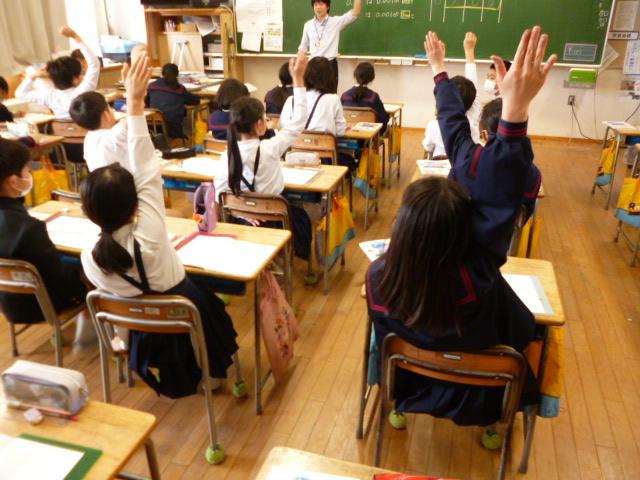 自分の考えを積極的に発表している姿。友達の意見を聞き逃さぬように聞いている姿・
