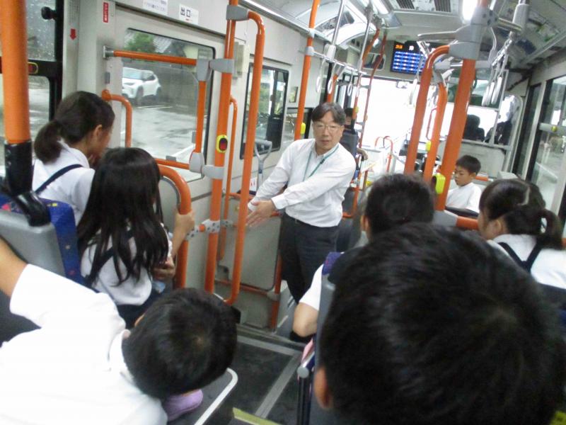 また、学校にやってきたバスに乗って、乗り方やマナーを教わったり、実際に乗車体験をしたりしました。