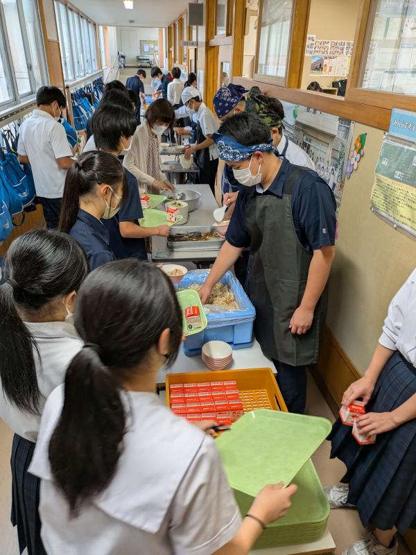 生徒たちは毎日おいしい給食をいただいています。栄養教諭の中村先生、調理員のみなさんいつもありがとうございます。日本で給食が始まったのが、なんと今から100年以上も前の明治22年からだそうです。ちなみにその時のメニューは「おにぎり・塩鮭・漬物」だったそうです。昭和29年には、学校給食法が制定され、学校給食は教育の一環となりました。世界の国々でも給食は導入されているそうですが、この値段でこの質と量は世界一かもしれません。まさに究極の食事です。