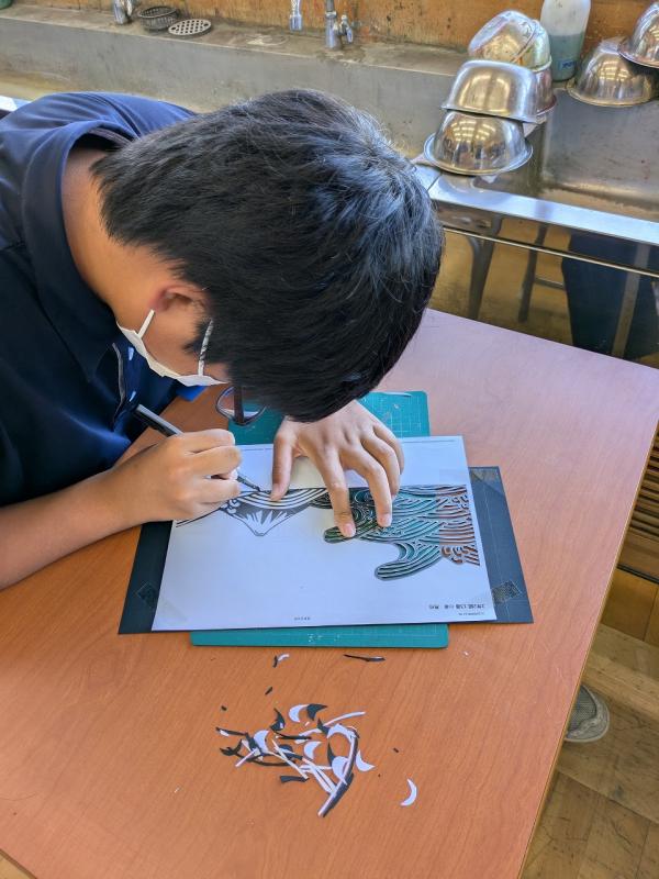 今、2年生の美術では「切り絵」制作に取り組んでいます。デザインカッター・糊・定規などを駆使して細かい作業に没頭しています。さすがに集中力を必要とするため、作業中はとても静かです。びっくりするぐらいシーンとしています。こういった作業がとても好きな生徒。手先が器用な生徒。作品に思いが込められていて、みんなの個性があふれ出ています。完成品が楽しみです。