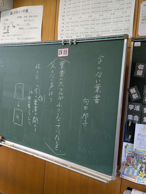 さて、今日の授業の題材は、日本を代表する昭和の小説家「向田邦子」さんが書いた「字のない葉書」でした。これは向田さん自身のことを書いたものでもあります。「父親の愛情」と「戦争の悲惨さ」が描かれており、今もなお多くの人々の心に残る作品になっています。向田さんは1929年8月、飛行機事故で51歳という若さでお亡くなりになりました。もし、ご存命であるならば、その後も日本の文学史に残る多くの作品を出していたことでしょう。