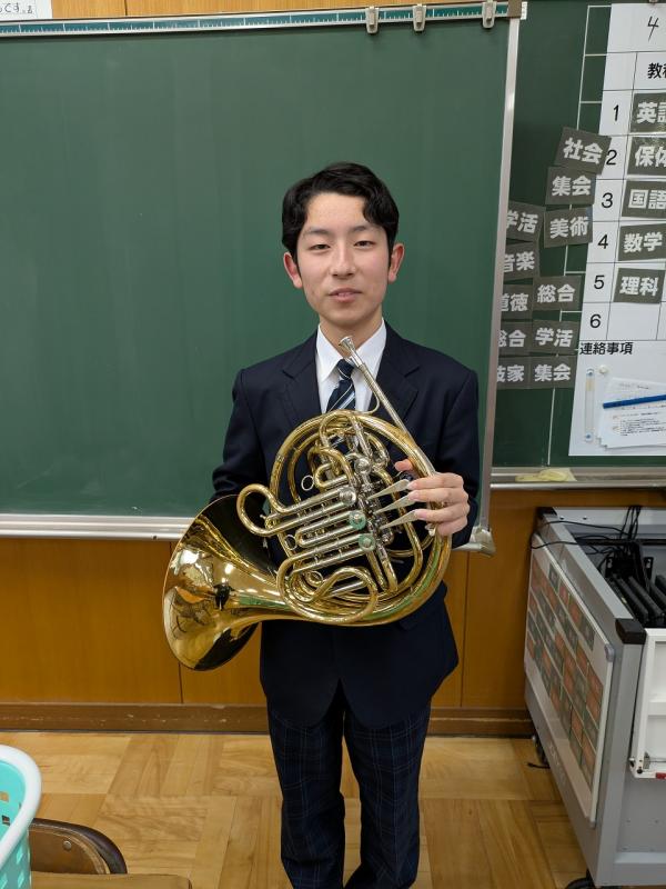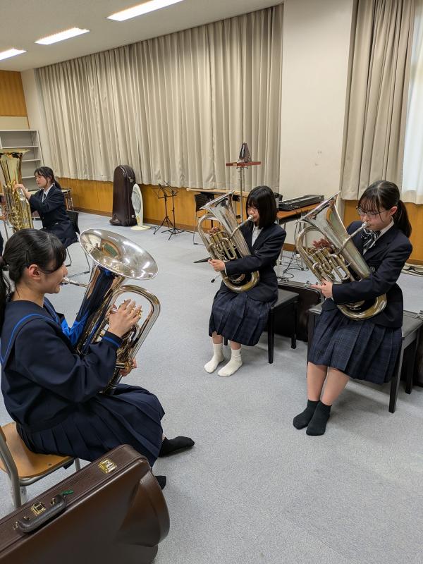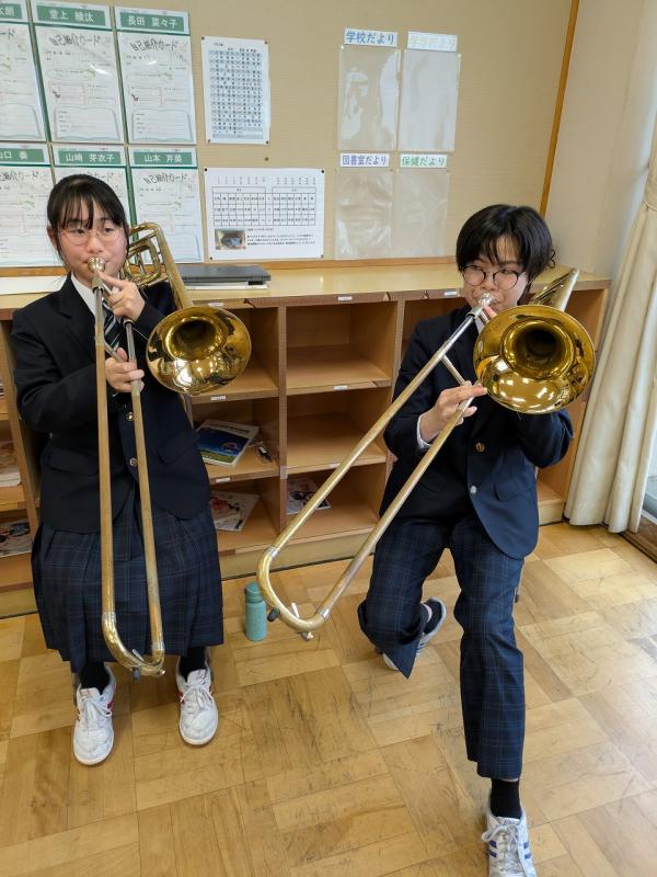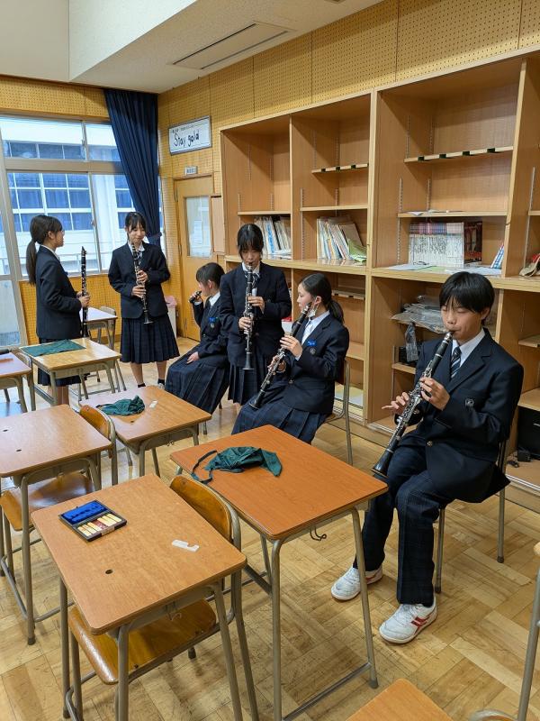 さて、本校には多くの運動部があると同時に、日々頑張っている文化部もあります。今日はその一つである吹奏楽部を紹介します。男子9名・女子37名、計46名の大所帯です。部長の早川透生さんに聞いたところ、「聴いてくれる人に感動を!」をモットーに、全日本吹奏楽コンクールに出場することを目標に日々練習に励んでいるそうです。今日は新しく入部した1年生に、先輩たちが熱心に指導する姿が多く見られました。これからも素敵な音色を奏でてくださいね。
