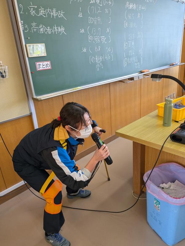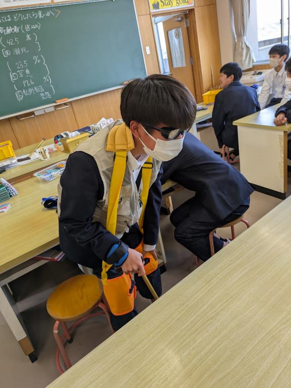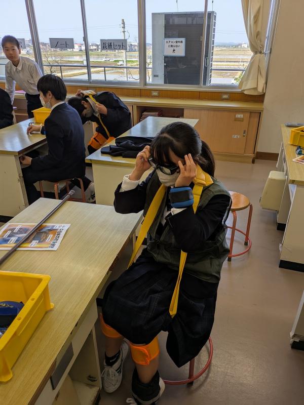 本日(4月30日)、家庭科の授業で「家庭内事故防止」について学ぶことができました。この背景には、近年、高齢者の家庭内における事故が多発していることから始まっているそうです。年配の方々の目線に立って実際に体験してみることで、高齢者の方々のみならず、体が不自由な方に対する「思いやりの精神」を感じることができたと思います。