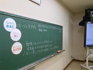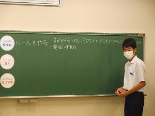 ①「安全に」「賢く」の視点で、ルールを考えます。生徒指導担当の茶谷先生の報告を聞き、意見を出し合いました。