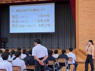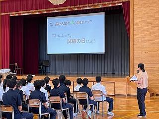 3年生はその後、本校の進路担当である岡本先生から、津幡南中学校での進路指導の予定や注意するべき点などの説明を聞きました。