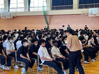 本校の2・3年生の生徒を対象に、県内7校の高校の先生方をお招きして、各学校の特色や現状、中学校時代につけてほしい力や、高校を選択するにあたっての必要なことなどについて説明を聞くことができました。