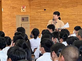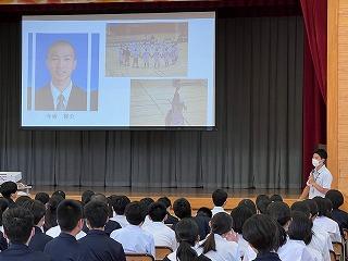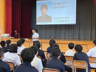 2年生の先生方から高校時代の体験談を聞いたり、当時の写真を紹介されたりして、生徒たちはとても興味深く話に聞き入っていました。