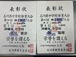 津幡南中の選手は、北川さんと堀さんの2名が入賞です。おめでとうございます!