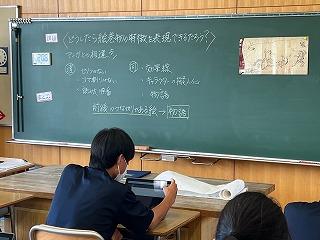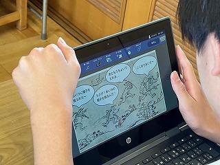 「鳥獣戯画」を題材として、書かれている動物の台詞を考えたり、話の内容を動物を使って表現したりと、ICT機器を使って工夫した授業が展開されました。