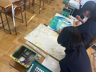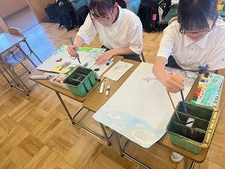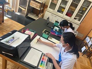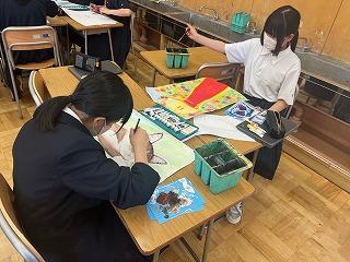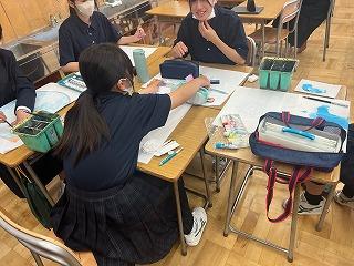 2年生は、オリジナルTシャツ、1年生は刺繍の作品を制作しています。
