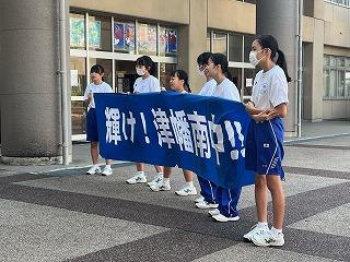 「輝け!津幡南中学校」の横断幕を掲げての、爽やかなあいさつでした。