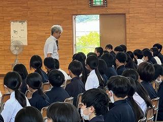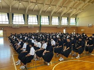 本日午後、1年生を対象に体育館にて、北陸大学薬学部の宇佐見教授と大学の学生を招いて、薬物乱用防止教室が行われました。