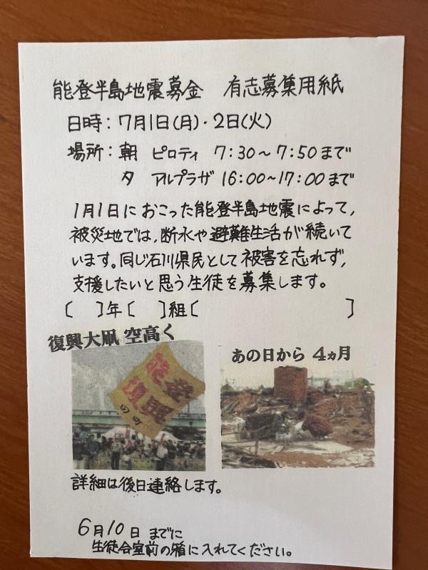 ◯全校生徒へ、能登半島地震募金への協力を呼びかける有志を募集しています。