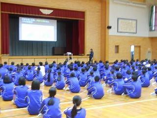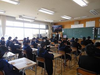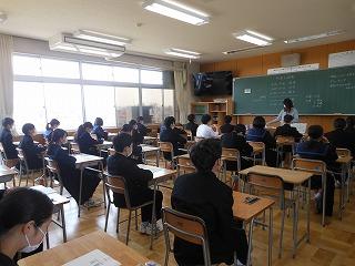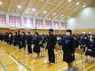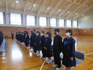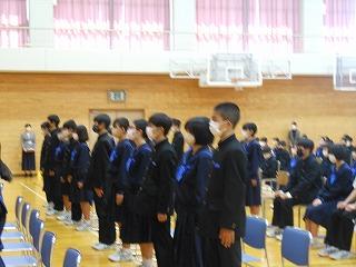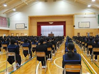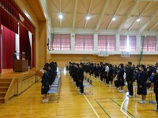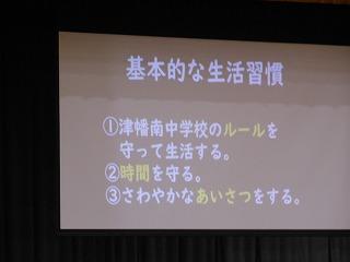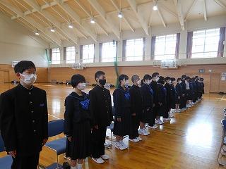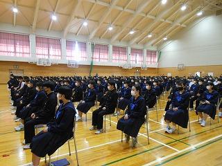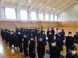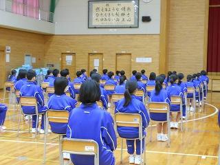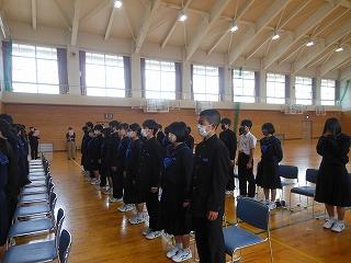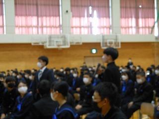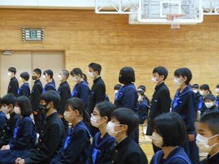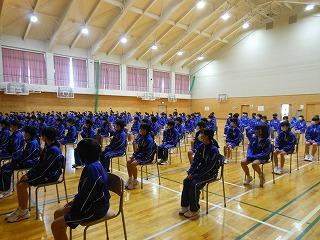 今日は1限目に全校集会を行いました。1・3年生は体育館で、2年生は卓球場でリモートです。永井校長先生のお話に続いて、3名の先生方のお話がありました。1年の初めに、学校生活についてのルールを茶谷先生が、清掃の取組については中先生と村上先生が、学習面のルールについては岡本先生からお話しいただきました。いつもの集会より長かったですが、3年生を中心に立派な態度で参加することができました。