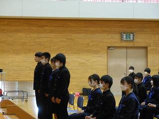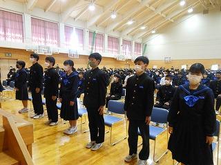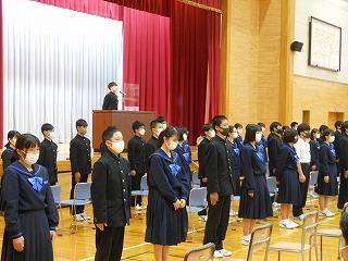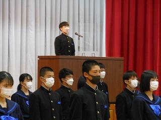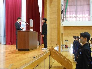 全校集会に続いて、前期生徒会役員・代議員任命式も行いました。生徒会役員と専門委員長、各学級から選ばれた代議員(会長・副会長)に永井校長先生が任命状を渡しました。任命された生徒を代表して、柳谷内治人生徒会長が全校生徒に向けて挨拶を行いました。