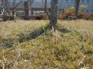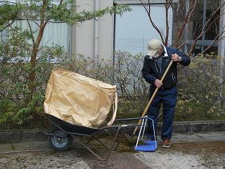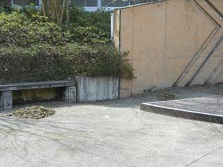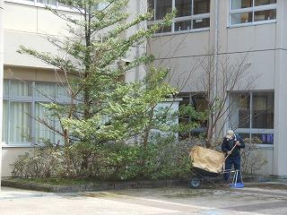 6日の新入生オリエンテーション、7日の始業式・入学式に備えて、玄関周りの整備を着任された校務員の葭田さんがされています。ベンチ下にたまった草やコケ類などを取り除き、ステージもすっきりしてきました。
