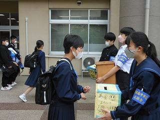 前期生徒会の活動であるウクライナ支援募金が今日から始まりました。期間は今日から27日(金)までの9日間です。昨日、全校生徒に配られた募金袋にお金を入れて、今朝も多くの生徒が協力をしてくれました。ありがとうございました。