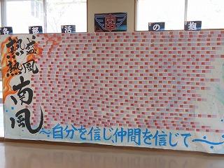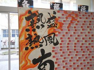 展示ホールに全校生徒と美術部で作成した「部活動応援メッセージ」の巨大掲示物が掲示されました。来週の陸上部も皮切りに3年生部員にとって集大成となる各種大会が始まります。
